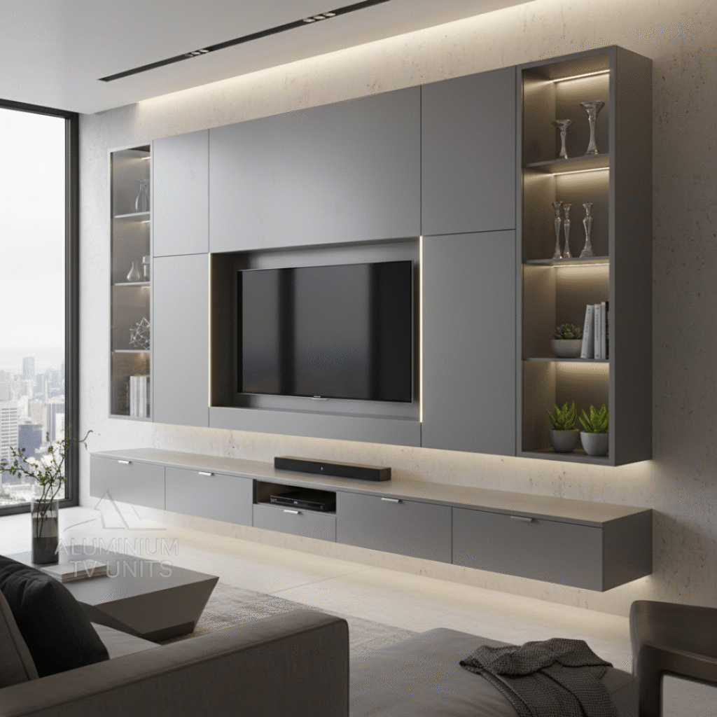 Our modern aluminium TV units are designed to enhance your living room while keeping it organized, minimal, and classy.